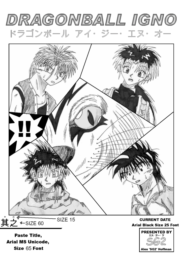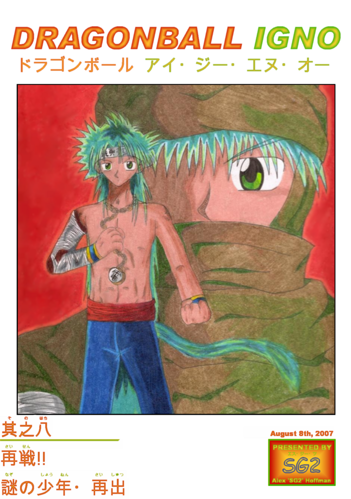 The title pages for the individual fic chapters. This one is for the prologue and sports Gokou and Uubu, as well as a transparent Goten (with short-long hair like at the end of DBZ, allowing my excuse for the fact that I wasn't even aware of how much longer I drew it until recently...he just grew it out over the 3 months between the end of Z and beginning of IGNO ^^; ).